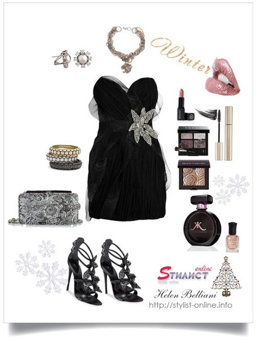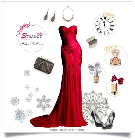 Очень изысканный вариант для женщин и девушек, предпочитающих элегантный стиль. Цветовая гамма подойдет как блондинкам, так и брюнеткам. Такое сочетание ярких аксессуаров можно позволить себе, пожалуй, только в сказочную Новогоднюю ночь.